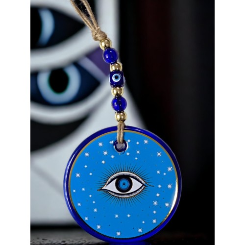 Açık, ferahlığı ve huzuru simgeleyen mavi tonlarıyla tasarlanan bu yıldız işlemeli göz model duvar süsü, nazar boncuğu detaylarıyla zenginleştirilmiş özel bir el yapımı cam dekor ürünüdür. Göz figürü nazardan korunma inancını temsil ederken, yıldız motifi tasarıma estetik ve anlamlı bir dokunuş kazandırır.