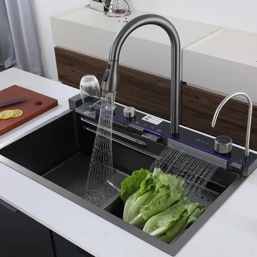 Mutfağınızda teknoloji, şıklık ve üstün işlevselliği birleştiren bu Nordmende Yeni Nesil Şelale Eviye Seti ile mutfak deneyiminizi geleceğe taşıyın! Bu set, size sadece bir eviye değil, tam donanımlı bir akıllı mutfak istasyonu sunar.Öne Çıkan Lüks Özellikler:Dijital LED Gösterge: Elektrik bağlantısı istemeyen dinamolu sistemi sayesinde, suyun sıcaklığını ve basıncını anlık olarak gösterir. Mutfakta tam kontrol parmaklarınızın ucunda.Şelale Musluk ve El Duşu: Modern şelale akışı ile estetik bir dokunuş sağlarken, spiral 4 fonksiyonlu el duşu başlığı ile tüm temizlik ihtiyaçlarınızı kolayca karşılarsınız.Piyano Tip Tuş Takımı: Ergonomik ve şık piyano tip tuş takımı ile su akış fonksiyonları arasında pratik geçiş yapın.Üstün Malzeme ve Boyut: 75 x 46 cm geniş eviye ölçüsü ve 304 kalite paslanmaz çelik tezgahı ile uzun ömürlü dayanıklılık ve hijyen sunar.İşlevsel Detaylar:Çok Fonksiyonlu Hazneler: Bardak yıkama haznesi, sebze yıkama çıkışı ve tabak yıkama çıkışı ile yıkama ve hazırlık işlemlerini optimize eder.Sessiz ve Çevre Dostu: Su sesi önleyici kaplama ve bant sayesinde sessiz kullanım sunar. Akıllı teknolojisi ile su ve enerji verimliliği sağlayarak çevre ve cep dostudur.Kapsamlı Set İçeriği: Sabunluk dahil olmak üzere tüm montaj ve kullanım aparatları kutu içeriğinde mevcuttur. Pratik montaj ile dakikalar içinde kullanıma hazırdır.Bu eviye seti, minimalist ve şık tasarımıyla her mutfak dekorasyonuna uyum sağlar ve mutfağınıza hak ettiği konforu getirir.