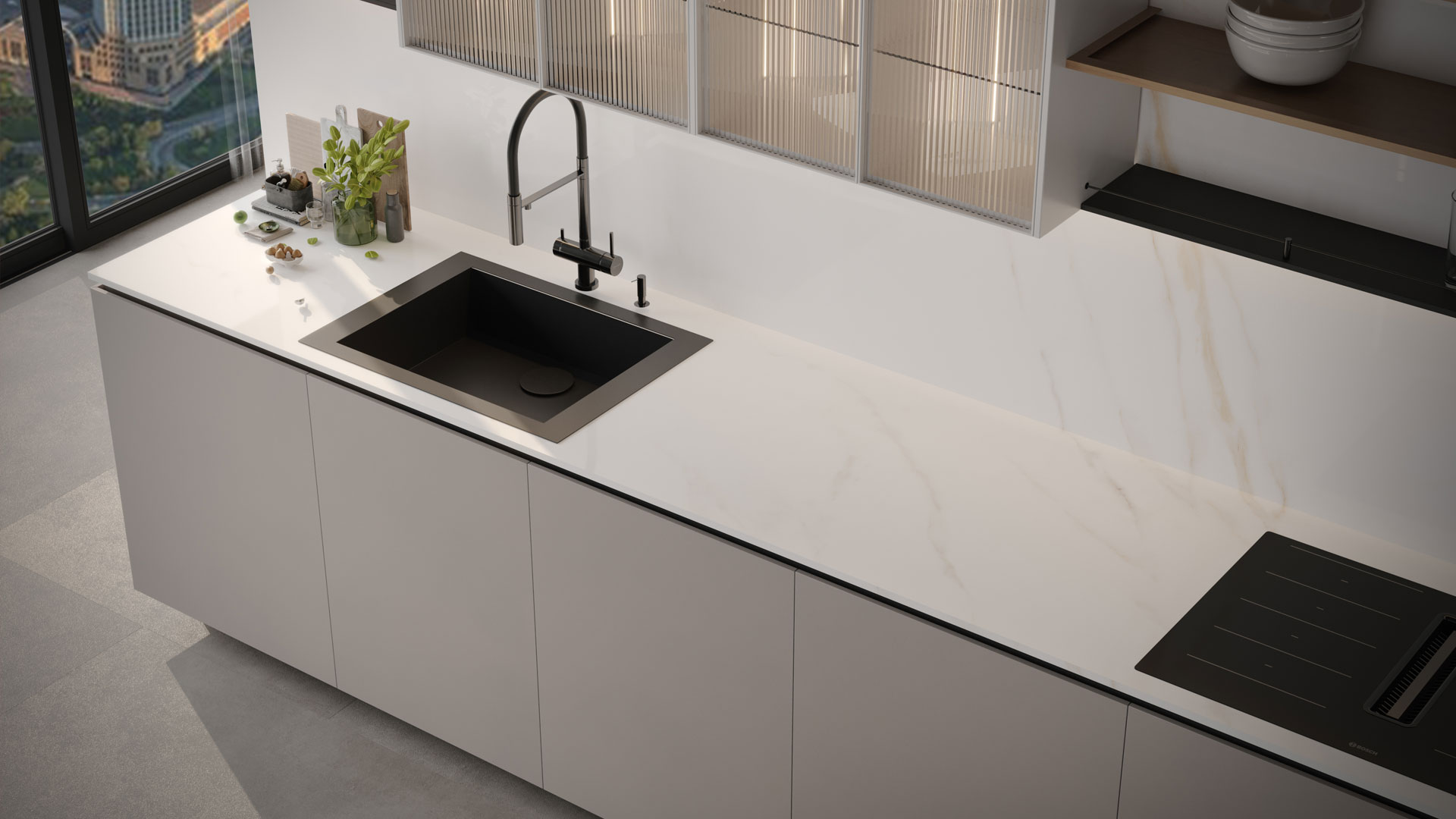 Calacatta Derma; özel ince damarlara sahip bir levhadır. Çarpıcı, parlak porselen görünümü için cilalı olarak da sunulur.