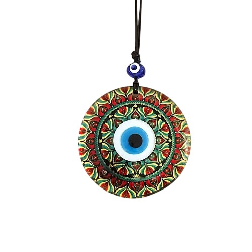 Kırmızı Çiçek Desenli Ve Nazar Boncuklu El Yapımı Füzyon Cam Duvar Süsü