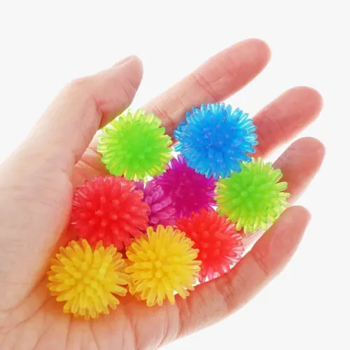 Parmak Masaj Topu (Dikenli Duyu Topları Seti)Ürün AçıklamasıEl ve parmak sağlığınızı desteklemek, kan dolaşımını hızlandırmak ve stresi azaltmak için tasarlanmış renkli ve eğlenceli bir çözümdür! Bu Parmak Masaj Topları, küçük, dikenli yapısıyla hem masaj hem de duyusal uyarı sağlar. Özellikle uzun süre klavye kullananlar, el yorgunluğu çekenler veya rehabilitasyon egzersizleri yapanlar için idealdir. Görselde görüldüğü gibi, parlak ve canlı renk seçenekleriyle (yeşil, mavi, sarı, kırmızı, mor) motivasyonu artırır. Yumuşak, esnek ve dikenli dokusu sayesinde avuç içindeki ve parmaklardaki sinir uçlarını uyararak rahatlama sağlar.Ürün ÖzellikleriTasarım: Küçük boyutlu, yuvarlak ve esnek dikenli yapıMalzeme: Yumuşak, esnek ve sağlıklı kullanım sunan dayanıklı malzeme.Fonksiyon: El ve parmaklardaki kan dolaşımını hızlandırır, kasları gevşetir ve masaj etkisi yaratır.Duyusal Uyarı: Dikenli yüzeyi sayesinde duyusal ve dokunsal algıyı güçlendirir.Renkler: Parlak ve çeşitli renklerde (yeşil, mavi, sarı, kırmızı, mor vb.) mevcuttur.Kullanım AlanlarıRehabilitasyon: El ve parmak sakatlanmaları veya ameliyatları sonrası hafif egzersizler ve hareket aralığını artırmak için.Stres Giderme: Stresi ve gerginliği azaltmak için elde sıkma ve yuvarlama egzersizleri yapmak.Mesleki Kullanım: Uzun süreli yazı yazan, daktilo kullanan veya el becerisi gerektiren işlerde çalışan kişilerde el yorgunluğunu gidermek için.Duyusal Oyun: Çocuklarda ve yetişkinlerde dokunsal duyusal entegrasyonu desteklemek amacıyla.Paket İçeriğiAdet ve renk sayısı değişiklik gösterebilir